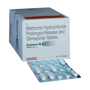 Geminor M 0.5 Tablet PR is a combination of two medicines: glimepiride and metformin. This medicine is used in the treatment of type 2 diabetes mellitus (DM). It improves blood glucose levels in adults when taken along with a proper diet and regular exercise. Glimepiride lowers the blood glucose levels by increasing the release of insulin from the pancreas. Metformin works by lowering glucose production in the liver and improving insulin sensitivity. This combination is not indicated for the treatment of type 1 DM.
