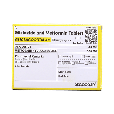Gliclagood M 40 Tablet is a combination of two medicines: Gliclazide and Metformin. This medicine is used in the treatment of type 2 diabetes mellitus (DM). It improves blood glucose levels in adults when taken along with proper diet and regular exercise. Gliclazide lowers the blood glucose levels by increasing the release of insulin from the pancreas. Metformin works by lowering the glucose production in the liver and improving insulin sensitivity. This combination is not indicated for the treatment of Type 1 DM.
