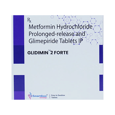 Glidimin 2 Forte Tablet PR is a combination of two medicines: glimepiride and metformin. This medicine is used in the treatment of type 2 diabetes mellitus (DM). It improves blood glucose levels in adults when taken along with a proper diet and regular exercise. Glimepiride lowers the blood glucose levels by increasing the release of insulin from the pancreas. Metformin works by lowering glucose production in the liver and improving insulin sensitivity. This combination is not indicated for the treatment of type 1 DM.