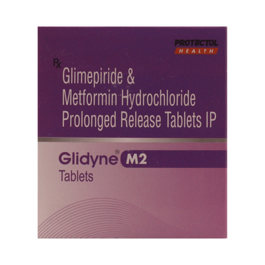 Glidyne M 2 Tablet PR is a combination of two medicines: glimepiride and metformin. This medicine is used in the treatment of type 2 diabetes mellitus (DM). It improves blood glucose levels in adults when taken along with a proper diet and regular exercise. Glimepiride lowers the blood glucose levels by increasing the release of insulin from the pancreas. Metformin works by lowering glucose production in the liver and improving insulin sensitivity. This combination is not indicated for the treatment of type 1 DM.