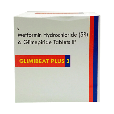 Glimibeat Plus 3 Tablet SR is a combination of two medicines: glimepiride and metformin. This medicine is used in the treatment of type 2 diabetes mellitus (DM). It improves blood glucose levels in adults when taken along with a proper diet and regular exercise. Glimepiride lowers the blood glucose levels by increasing the release of insulin from the pancreas. Metformin works by lowering glucose production in the liver and improving insulin sensitivity. This combination is not indicated for the treatment of type 1 DM.