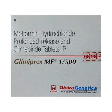 Glimiprex MF 1/500 Tablet PR is a combination of two medicines: glimepiride and metformin. This medicine is used in the treatment of type 2 diabetes mellitus (DM). It improves blood glucose levels in adults when taken along with a proper diet and regular exercise. Glimepiride lowers the blood glucose levels by increasing the release of insulin from the pancreas. Metformin works by lowering glucose production in the liver and improving insulin sensitivity. This combination is not indicated for the treatment of type 1 DM.