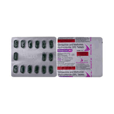 Glimiprime-M 3 Tablet is a combination of two medicines: glimepiride and metformin. This medicine is used in the treatment of type 2 diabetes mellitus (DM). It improves blood glucose levels in adults when taken along with a proper diet and regular exercise. Glimepiride lowers the blood glucose levels by increasing the release of insulin from the pancreas. Metformin works by lowering glucose production in the liver and improving insulin sensitivity. This combination is not indicated for the treatment of type 1 DM.