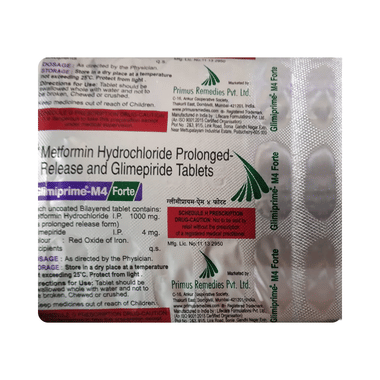 Glimiprime-M 4 Forte Tablet PR is a combination of two medicines: glimepiride and metformin. This medicine is used in the treatment of type 2 diabetes mellitus (DM). It improves blood glucose levels in adults when taken along with a proper diet and regular exercise. Glimepiride lowers the blood glucose levels by increasing the release of insulin from the pancreas. Metformin works by lowering glucose production in the liver and improving insulin sensitivity. This combination is not indicated for the treatment of type 1 DM.
