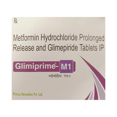 Glimiprime-M1 Tablet PR is a combination of two medicines: glimepiride and metformin. This medicine is used in the treatment of type 2 diabetes mellitus (DM). It improves blood glucose levels in adults when taken along with a proper diet and regular exercise. Glimepiride lowers the blood glucose levels by increasing the release of insulin from the pancreas. Metformin works by lowering glucose production in the liver and improving insulin sensitivity. This combination is not indicated for the treatment of type 1 DM.