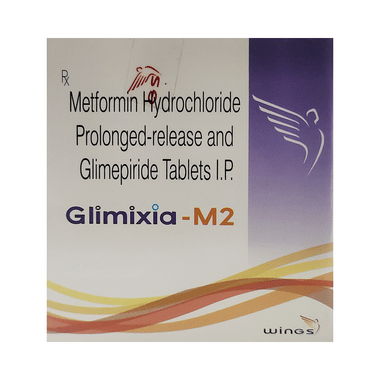Glimixia-M 2 Tablet PR is a combination of two medicines: glimepiride and metformin. This medicine is used in the treatment of type 2 diabetes mellitus (DM). It improves blood glucose levels in adults when taken along with a proper diet and regular exercise. Glimepiride lowers the blood glucose levels by increasing the release of insulin from the pancreas. Metformin works by lowering glucose production in the liver and improving insulin sensitivity. This combination is not indicated for the treatment of type 1 DM.