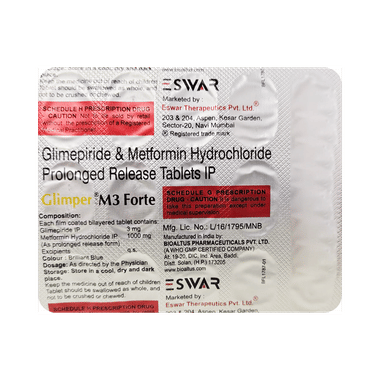 Glimper M 3 Forte Tablet PR is a combination of two medicines: glimepiride and metformin. This medicine is used in the treatment of type 2 diabetes mellitus (DM). It improves blood glucose levels in adults when taken along with a proper diet and regular exercise. Glimepiride lowers the blood glucose levels by increasing the release of insulin from the pancreas. Metformin works by lowering glucose production in the liver and improving insulin sensitivity. This combination is not indicated for the treatment of type 1 DM.