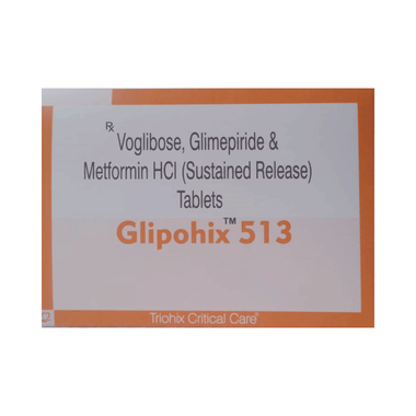 Glipohix 513 Tablet SR is a combination of medicines used in the treatment of type 2 diabetes mellitus (DM). It improves the blood glucose levels in adults when taken along with a proper diet and regular exercise. Glimepiride lowers the blood glucose levels by increasing the release of insulin from the pancreas. Metformin works by lowering glucose production in the liver and improving insulin sensitivity. Voglibose is an alpha-glucosidase inhibitor that lowers the postprandial (after meals) glucose levels in the body. This combination is not indicated for the treatment of type 1 DM.