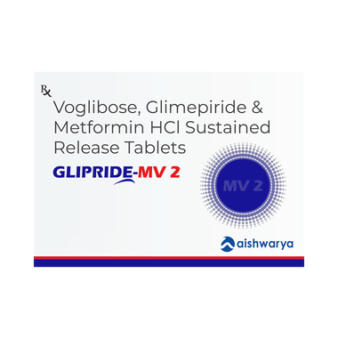Glipride-MV 2 Tablet SR is a combination of three medicines: Glimepiride, Metformin and Voglibose. This medicine is used in the treatment of type 2 diabetes mellitus (DM). It improves the blood glucose levels in adults when taken along with proper diet and regular exercise. Glimepiride lowers the blood glucose levels by increasing the release of insulin from the pancreas. Metformin works by lowering the glucose production in the liver and improving insulin sensitivity. Voglibose is an alpha-glucosidase inhibitor which lowers the postprandial (after meals) glucose levels in the body. This combination is not indicated for the treatment of Type 1 DM.