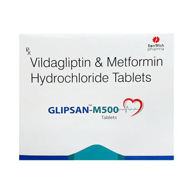 Glipsan-M 500 Tablet is a combination of two anti-diabetic drugs: metformin and vildagliptin. Metformin is an anti-diabetic medicine and belongs to the class of biguanides. It lowers the glucose production in the liver, delays glucose absorption from the intestines, and increases the body's sensitivity to insulin. Vildagliptin inhibits the enzyme DPP4 and increases the release of insulin from the pancreas. This combination is not advised for patients below 18 years of age.