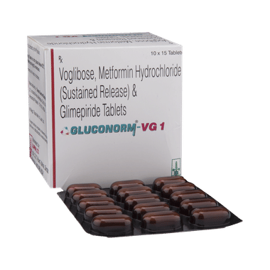 Gluconorm-VG 1 Tablet SR is a combination of medicines used in the treatment of type 2 diabetes mellitus (DM). It improves the blood glucose levels in adults when taken along with a proper diet and regular exercise. Glimepiride lowers the blood glucose levels by increasing the release of insulin from the pancreas. Metformin works by lowering glucose production in the liver and improving insulin sensitivity. Voglibose is an alpha-glucosidase inhibitor that lowers the postprandial (after meals) glucose levels in the body. This combination is not indicated for the treatment of type 1 DM.