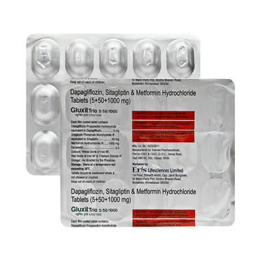 Gluxit Trio 5mg/1000mg/50mg Tablet is a combination medicine that helps control blood sugar levels. This medicine is used with diet and exercise to improve blood sugar control in adults with type 2 diabetes mellitus. It helps in the proper utilization of insulin, thereby lowering the blood sugar level.Gluxit Trio 5mg/1000mg/50mg Tablet can be taken with or without food at any time of the day, but try to take it at the same time every day. The dose will be decided by your doctor, so do not stop taking it without asking them. If you do, your blood sugar levels may increase your risk of serious complications like kidney damage and blindness. This medicine is only a part of the treatment program that should include a healthy diet, regular exercise, and weight reduction as advised by your doctor.