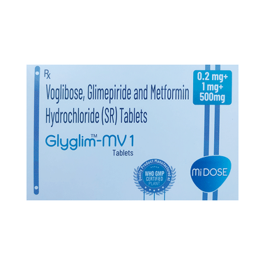 Glyglim-MV 1 Tablet SR is a combination of three medicines: Glimepiride, Metformin and Voglibose. This medicine is used in the treatment of type 2 diabetes mellitus (DM). It improves the blood glucose levels in adults when taken along with proper diet and regular exercise. Glimepiride lowers the blood glucose levels by increasing the release of insulin from the pancreas. Metformin works by lowering the glucose production in the liver and improving insulin sensitivity. Voglibose is an alpha-glucosidase inhibitor which lowers the postprandial (after meals) glucose levels in the body. This combination is not indicated for the treatment of Type 1 DM.