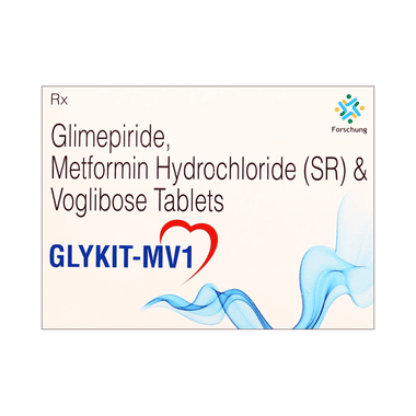 Glykit-MV 1 Tablet SR is a combination of three medicines: Glimepiride, Metformin and Voglibose. This medicine is used in the treatment of type 2 diabetes mellitus (DM). It improves the blood glucose levels in adults when taken along with proper diet and regular exercise. Glimepiride lowers the blood glucose levels by increasing the release of insulin from the pancreas. Metformin works by lowering the glucose production in the liver and improving insulin sensitivity. Voglibose is an alpha-glucosidase inhibitor which lowers the postprandial (after meals) glucose levels in the body. This combination is not indicated for the treatment of Type 1 DM.