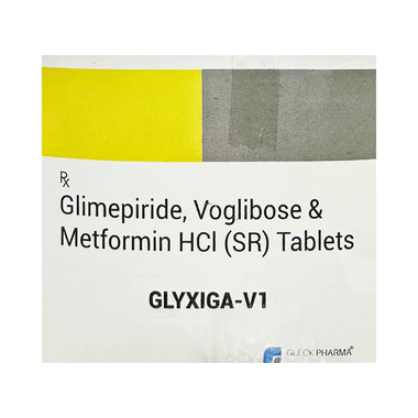 Glyxiga-V1 Tablet SR is a combination of three medicines: Glimepiride, Metformin and Voglibose. This medicine is used in the treatment of type 2 diabetes mellitus (DM). It improves the blood glucose levels in adults when taken along with proper diet and regular exercise. Glimepiride lowers the blood glucose levels by increasing the release of insulin from the pancreas. Metformin works by lowering the glucose production in the liver and improving insulin sensitivity. Voglibose is an alpha-glucosidase inhibitor which lowers the postprandial (after meals) glucose levels in the body. This combination is not indicated for the treatment of Type 1 DM.