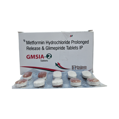 GMSIA Tablet PR 2 is a combination of two medicines: glimepiride and metformin. This medicine is used in the treatment of type 2 diabetes mellitus (DM). It improves blood glucose levels in adults when taken along with a proper diet and regular exercise. Glimepiride lowers the blood glucose levels by increasing the release of insulin from the pancreas. Metformin works by lowering glucose production in the liver and improving insulin sensitivity. This combination is not indicated for the treatment of type 1 DM.