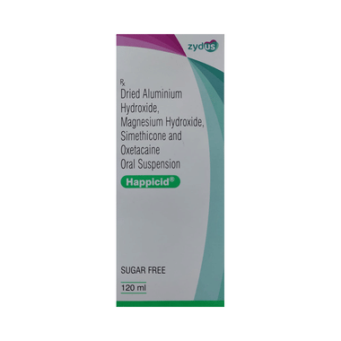 Happicid Oral Suspension Sugar Free is a combination medicine used in the treatment of acidity, stomach ulcer and bloating. It helps in relieving the symptoms of acidity and ulcers such as stomach pain or irritation. It also neutralizes excessive acid in the stomach and helps in easy passage of gas.