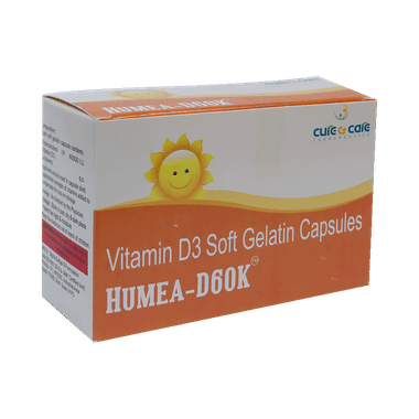 Humea-D60K Soft Gelatin Capsule is used in the treatment of vitamin D deficiency and osteoporosis. It helps the body to absorb calcium. Calcium is essential for maintaining strong and healthy bones. It is used when your diet does not provide enough calcium.Humea-D60K Soft Gelatin Capsule should be taken as directed by your doctor. It is best taken with or after food, as this helps your body absorb it, and you should take it regularly to get the most benefits. If you are using it to treat osteoporosis, you will also be prescribed other medicines. This medicine may be only part of a complete treatment program that includes making changes to your diet and taking calcium and vitamin supplements. Absorb about the foods you should eat to ensure you get enough calcium and vitamin D.