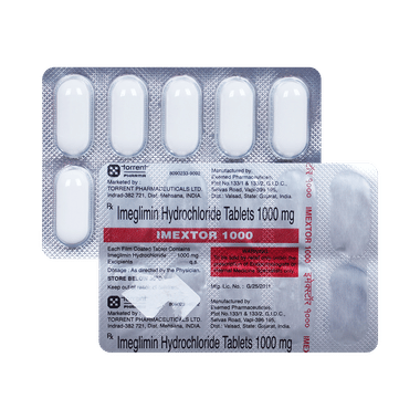 Imextor 1000mg Tablet is normally prescribed when diet and exercise alone or other medicines do not prove sufficient to control your blood sugar level. Your doctor may prescribe it alone or in combination with other diabetes medicines. It can be taken with or without food. The dose will depend on your condition and blood sugar levels. Employ it strictly as advised by your doctor.