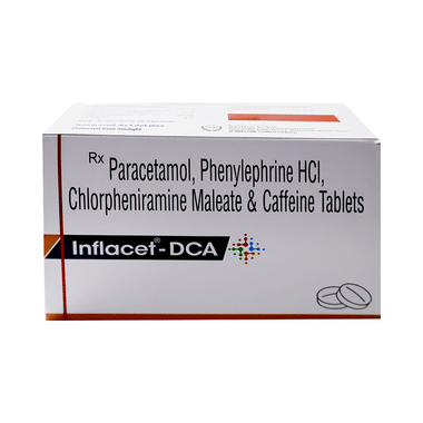 Inflacet-DCA Tablet is a combination of four medicines: Caffeine, Chlorpheniramine, Paracetamol and Phenylephrine. This combination is helpful in relieving the symptoms of cold. These symptoms may include body ache, headache, fatigue, fever, watery eyes, sneezing, cough, sore throat, and runny and stuffy nose.