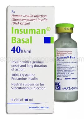 Insuman Basal 40IU/ml Injection is a man-made version of human insulin, produced by the process of biotechnology called recombinant DNA technology. It is sold as a sterile, aqueous, clear, and colorless solution that contains insulin aspart along with other constituents like glycerin, phenol, metacresol, zinc, sodium chloride etc.