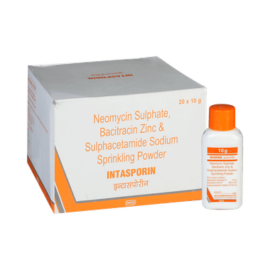 Intasporin Powder is only meant for external use and should be used as advised by your doctor. A thin layer of the medicine should be applied only to the affected areas of the skin with clean and dry hands. If it gets into your eyes, nose, mouth or vagina rinse with water. It may take several days to weeks for your symptoms to improve, but you should keep using this medicine regularly. The course of the treatment should be completed to ensure better efficacy of the medicine. If your condition does not improve or gets worse, you should talk to your doctor.