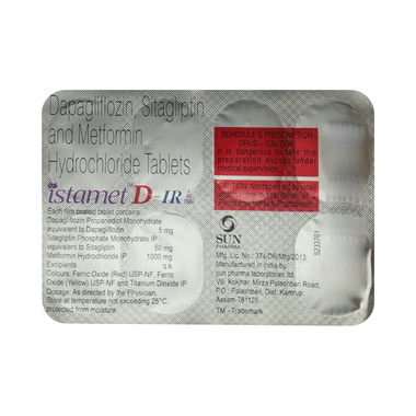 Istamet D -IR Tablet is a combination medicine that helps control blood sugar levels. This medicine is used together with diet and exercise to improve blood sugar control in adults with type 2 diabetes mellitus. It helps in proper utilization of insulin, thereby lowering the blood sugar level.Istamet D -IR Tablet can be taken with or without food at any time of the day but try to take it at the same time every day. The dose will be decided by your doctor, so don’t stop taking it without asking them. If you do, your blood sugar levels may increase your risk of serious complications like kidney damage and blindness. This medicine is only a part of the treatment program that should include a healthy diet, regular exercise, and weight reduction as advised by your doctor.