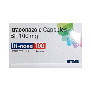 Iti-Nova 100 Capsule is used to treat fungal infections caused by Trichophyton spp., Microsporum spp., and Epidermophyton floccosum. The infections caused could be ringworm infection, infection of feet, or infection in groin and buttocks. This medicine also treats persistent infection of fingernails and toenails, persistent candida (yeast) infections of vagina or candida (yeast) infections of the mouth or throat in patients with lower resistance to disease. It is also used in the treatment of cryptococcal infection and infections caused by histoplasma, aspergillus and blastomyces.