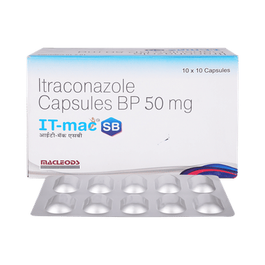 IT-Mac SB Capsule is used to treat fungal infections caused by Trichophyton spp., Microsporum spp., and Epidermophyton floccosum. The infections caused could be ringworm infection, infection of feet, or infection in groin and buttocks. This medicine also treats persistent infection of fingernails and toenails, persistent candida (yeast) infections of vagina or candida (yeast) infections of the mouth or throat in patients with lower resistance to disease. It is also used in the treatment of cryptococcal infection and infections caused by histoplasma, aspergillus and blastomyces.