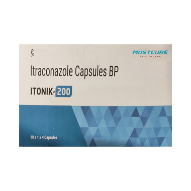 Itonik 200 Capsule is used to treat fungal infections caused by Trichophyton spp., Microsporum spp., and Epidermophyton floccosum. The infections caused could be ringworm infection, infection of feet, or infection in groin and buttocks. This medicine also treats persistent infection of fingernails and toenails, persistent candida (yeast) infections of vagina or candida (yeast) infections of the mouth or throat in patients with lower resistance to disease. It is also used in the treatment of cryptococcal infection and infections caused by histoplasma, aspergillus and blastomyces.