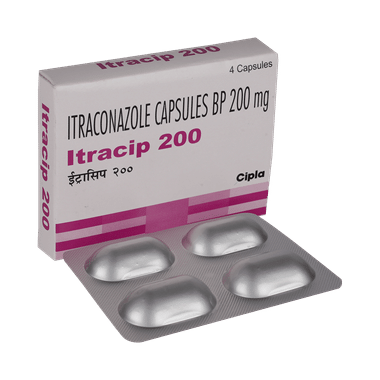 Itracip 200mg Capsule is used to treat fungal infections caused by Trichophyton spp., Microsporum spp., and Epidermophyton floccosum. The infections caused could be ringworm infection, infection of the feet, or infection in the groin and buttocks. This medicine also treats persistent infection of fingernails and toenails, persistent candida (yeast) infections of vagina or candida (yeast) infections of the mouth or throat in patients with lower disease resistance. It is also used in the treatment of cryptococcal infection and infections caused by Histoplasma, aspergillus, and Burstomyces.