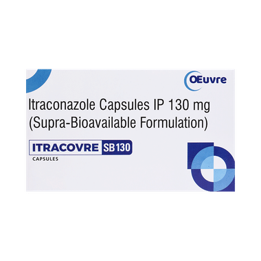 Itracovre SB 130 Capsule is used to treat fungal infections caused by Trichophyton spp., Microsporum spp., and Epidermophyton floccosum. The infections caused could be ringworm infection, infection of feet, or infection in groin and buttocks. This medicine also treats persistent infection of fingernails and toenails, persistent candida (yeast) infections of vagina or candida (yeast) infections of the mouth or throat in patients with lower resistance to disease. It is also used in the treatment of cryptococcal infection and infections caused by histoplasma, aspergillus and blastomyces.