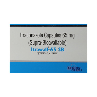 Itrawall 65 SB Capsule is used to treat fungal infections caused by Trichophyton spp., Microsporum spp., and Epidermophyton floccosum. The infections caused could be ringworm infection, infection of feet, or infection in groin and buttocks. This medicine also treats persistent infection of fingernails and toenails, persistent candida (yeast) infections of vagina or candida (yeast) infections of the mouth or throat in patients with lower resistance to disease. It is also used in the treatment of cryptococcal infection and infections caused by histoplasma, aspergillus and blastomyces.