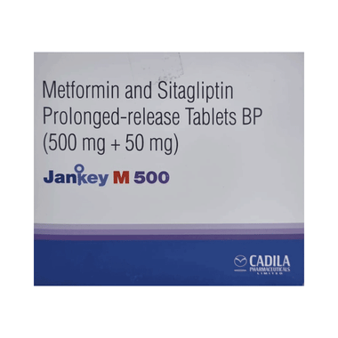 Jankey M 500 Tablet PR is a combination of two medicines: sitagliptin and metformin. This medicine is used in the treatment of type 2 diabetes mellitus. It improves blood glucose levels in adults when taken along with a proper diet and regular exercise. Metformin lowers glucose production in the liver and improves insulin sensitivity. Sitagliptin inhibits the enzyme DPP4 and increases insulin release from the pancreas. This combination is not indicated for patients below 18 years of age.