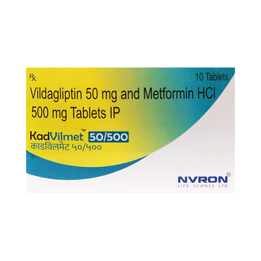 Kadvilmet 50/500 Tablet is a combination of two anti-diabetic drugs: metformin and vildagliptin. Metformin is an anti-diabetic medicine and belongs to the class of biguanides. It lowers the glucose production in the liver, delays glucose absorption from the intestines, and increases the body's sensitivity to insulin. Vildagliptin inhibits the enzyme DPP4 and increases the release of insulin from the pancreas. This combination is not advised for patients below 18 years of age.
