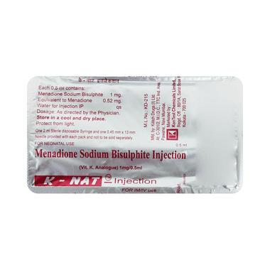 K-Nat Injection is the synthetic form of Vitamin K that provides essential nutrients. It is used in the treatment of nutritional deficiencies. It also helps in improving the conditions which are caused due to deficiency of Vitamin K in the body.