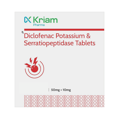 Kriam Pharma Diclofenac Potassium & Serratiopeptidase Tablet is a combination of two medicines. It is used to reduce pain and inflammation in conditions like rheumatoid arthritis, ankylosing spondylitis, and osteoarthritis. It is also used to relieve muscle pain, back pain, toothache, or pain in the ear and throat.