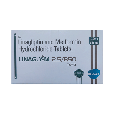Linagly-M 2.5/850 Tablet is a combination of two medicines used to help control high blood sugar levels in people with type 2 diabetes mellitus. It works by improving insulin action and reducing the amount of sugar produced by the liver.Linagly-M 2.5/850 Tablet may be prescribed alone or together with other diabetes medications. It works best when combined with a healthy diet and regular exercise. The dosage depends on your condition, blood sugar levels, and other medications you are taking. Taking it with meals can help minimize the risk of an upset stomach. Take Linagly-M 2.5/850 Tablet exactly as prescribed by your doctor.