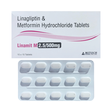 Linamit M 500mg/2.5mg Tablet is a combination of two medicines used to help control high blood sugar levels in people with type 2 diabetes mellitus. It works by improving insulin action and reducing the amount of sugar produced by the liver.