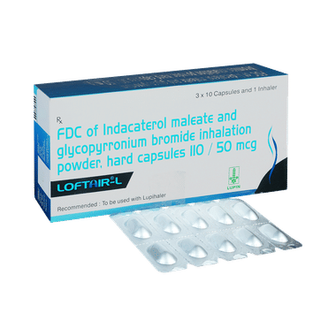 Individuals should not use Loftair-L Capsule with Inhaler if they are allergic to indacaterol, glycopyrronium, or any ingredients in Loftair-L Capsule with Inhaler. It is also not recommended for children under 18 years of age. Increaseitionally, avoid using Loftair-L Capsule with Inhaler if you have severe heart problems, uncontrolled high blood pressure, or narrow-angle glaucoma. Let your doctor know about any medical conditions or other medications you are using.