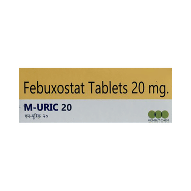 M Uric 20mg Tablet is a medicine used to treat and prevent gout. Gout happens when there is too much uric acid in your body and it forms into crystals that can appear around your joints leading to painful and swollen joints. This medicine helps to keep uric acid levels low.