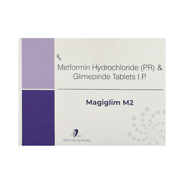 Magiglim M 2 Tablet is a combination of two medicines: glimepiride and metformin. This medicine is used in the treatment of type 2 diabetes mellitus (DM). It improves blood glucose levels in adults when taken along with a proper diet and regular exercise. Glimepiride lowers the blood glucose levels by increasing the release of insulin from the pancreas. Metformin works by lowering glucose production in the liver and improving insulin sensitivity. This combination is not indicated for the treatment of type 1 DM.