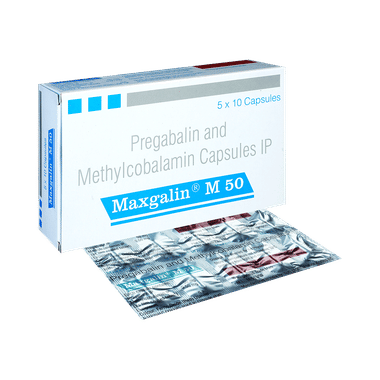 Maxgalin M 50 Capsule is a combination of two medicines: pregabalin and methylcobalamin. It is used for the treatment of nerve pain (neuropathic pain). It calms the damaged or overactive nerves by acting on the brain, thereby decreasing the pain sensation. It also helps in the regeneration of damaged nerves in the body.