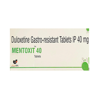 Mentoxit 40 Tablet is used in the treatment of depression, anxiety disorder, diabetic nerve pain, fibromyalgia (a condition in which there are generalized pain and tenderness in the body), neuropathic pain, and stress urinary incontinence.Mentoxit 40 Tablet works by increasing the level of chemical messengers (serotonin and noradrenaline) in the brain that have a calming effect on the brain and relax the nerves, thus treating your illness. It may be taken with or without food. It is advised to take this medicine at a fixed time each day to maintain a consistent level in the blood. If you miss any doses, take it as soon as you remember. Do not skip any doses and finish the full course of treatment even if you feel better. This medication mustn't be stopped suddenly as it may worsen your symptoms.