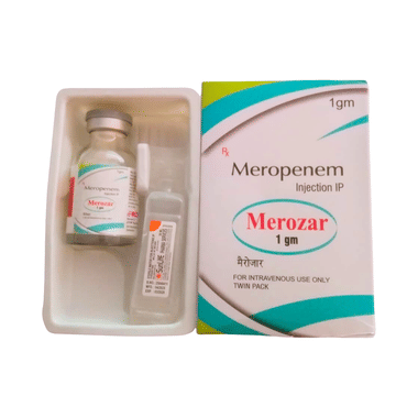 Merozar 1 gm Injection is an antibiotic that is used to treat severe infections of the skin, lungs, stomach, urinary tract, blood, and brain (eg. meningitis). It works by killing the bacteria that cause these problems. However, it will not treat a viral infection.Merozar 1 gm Injection is commonly used to treat critically ill patients admitted to the hospital. This medicine is given by drip/infusion or by direct injection into a vein, under the supervision of a doctor or a nurse. The dose will depend on what type of infection you have, where it is in the body, and how serious it is. You should keep on taking the injection for as long as you have been prescribed, even if your symptoms quickly improve. If you stop taking it too early the infection may return or worsen.