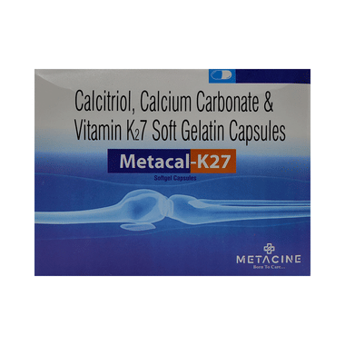 Metacal-K2 7 Softgel Capsule is a medicine used in the treatment of calcium deficiency. It increases the levels of vitamin D in your blood which in turn raises calcium levels in the blood by helping in the absorption of more calcium. It also helps in the treatment and prevention of osteoporosis.Metacal-K2 7 Softgel Capsule is a supplement that provides extra calcium to the body. It is beneficial in increasing muscle mass, osteoporosis and in the prevention and treatment of hypocalcemia. It also helps in reducing fatigue and muscular pains. It boosts immunity and helps you maintain healthy bones. It is generally safe with little or no side effects. However, if you experience any symptoms on taking this medicine, let your doctor know.