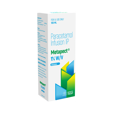 Metapect 1% W/V Infusion helps in relieving moderate pain and reducing fever. It effectively alleviates pain and reduces fever for the short-term in cases following surgery or in cases where oral administration is not possible.Metapect 1% W/V Infusion is administered by a doctor or a nurse and should not be self-administered. Depending on the severity of your underlying illness, your doctor will decide the precise dose and schedule as per which this injection is to be given. It starts working within one hour. Inform your doctor if you are also taking other medications containing paracetamol to avoid an overdose. You should let your doctor know if your pain or fever does not subside.