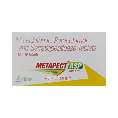 Metapect ASP Tablet is a combination medicine that relieves muscle, joint, and postoperative pain. It relieves pain and inflammation in conditions like rheumatoid arthritis, ankylosing spondylitis, and osteoarthritis.