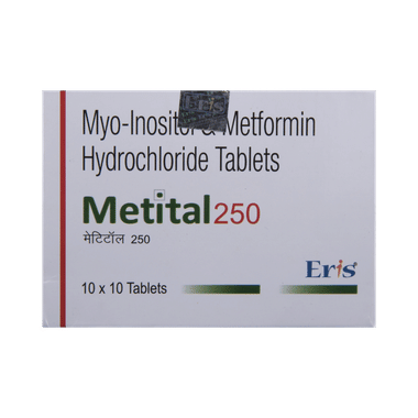 Metital 250 Tablet is a combination of two medicines: Metformin and Myo Inositol. This medicine is used in the treatment of Polycystic ovarian syndrome (PCOS). Metformin is an antidiabetic medicine which helps to regulate menstrual cycle by improving the insulin sensitivity. This helps in regularizing the menstrual cycles in women. Myo-inositol is safe and effective and acts as natural insulin sensitizer which helps to reduce androgen (male) hormones and restores ovulatory function in females.