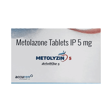 Metolyzin 5 Tablet is used to help the body remove excess salt and water. It is prescribed for swelling (edema) caused by heart failure or kidney problems, including nephrotic syndrome, and can also be used to help control high blood pressure, either alone or with other blood pressure medicines.